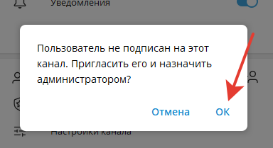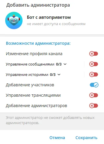 Нажмите “ОК” и далее дайте право боту “Добавление участников”. После нажмите “Сохранить”