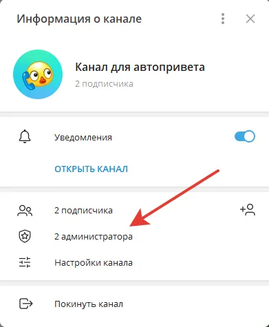 Откройте ваш канал и вберите пункт “Администраторы”