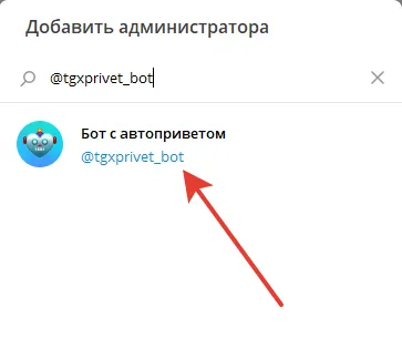 Нажмите кнопку “Добавить администратора” и в поиске введите имя вашего бота