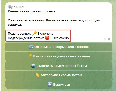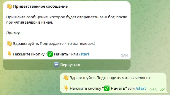7. Отправьте сообщение, которое будет присылать ваш бот всем, кто подал заявку в ваш закрытый канал: