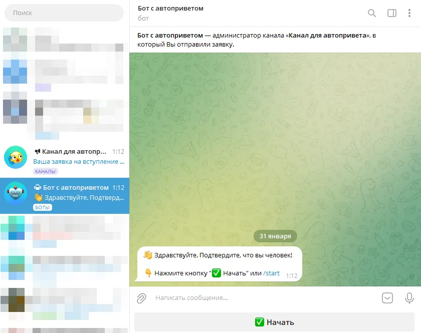 Ваш бот тут же одобрит заявку и напишет первый личное сообщение.