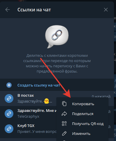 4. Скопируйте ссылку на чат с вашим личным профилем