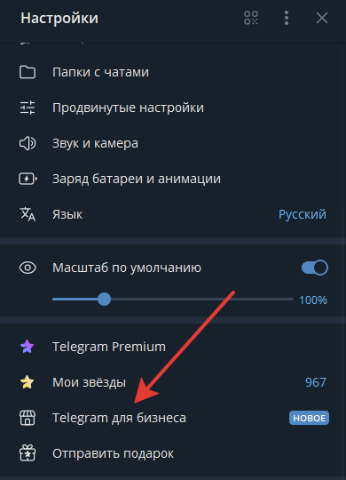 1. Откройте настройки в вашем личном профиле Telegram и выберите раздел Telegram для бизнеса